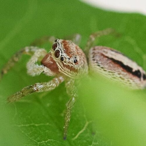 Data: 31/5/2021 - 14:00 Luogo: Brescia (BS) Posizione/Micro-habitat: Piante sul balcone Dimensione corpo: Piccola (5-10mm) Allego due foto di questo splendido ragnetto, trovato errante e salterino sulla mia pianta di plumbago (balcone in centro città). Dai movimenti rapidi mi ha colpito per il colore chiaro e il bel disegno. -