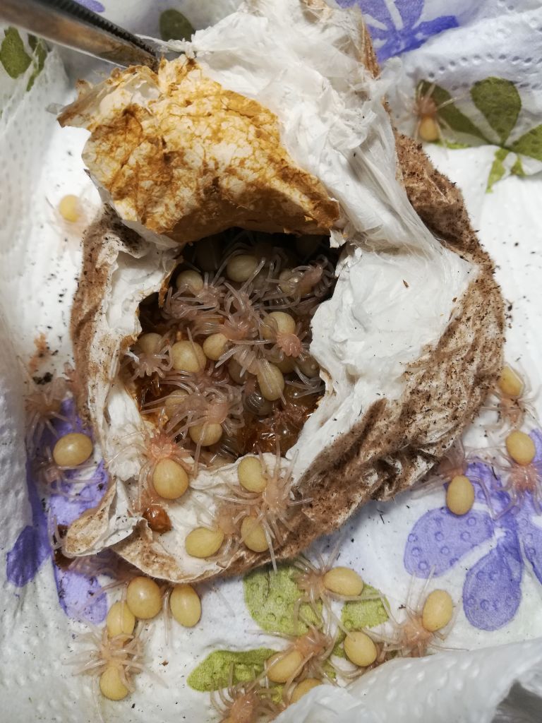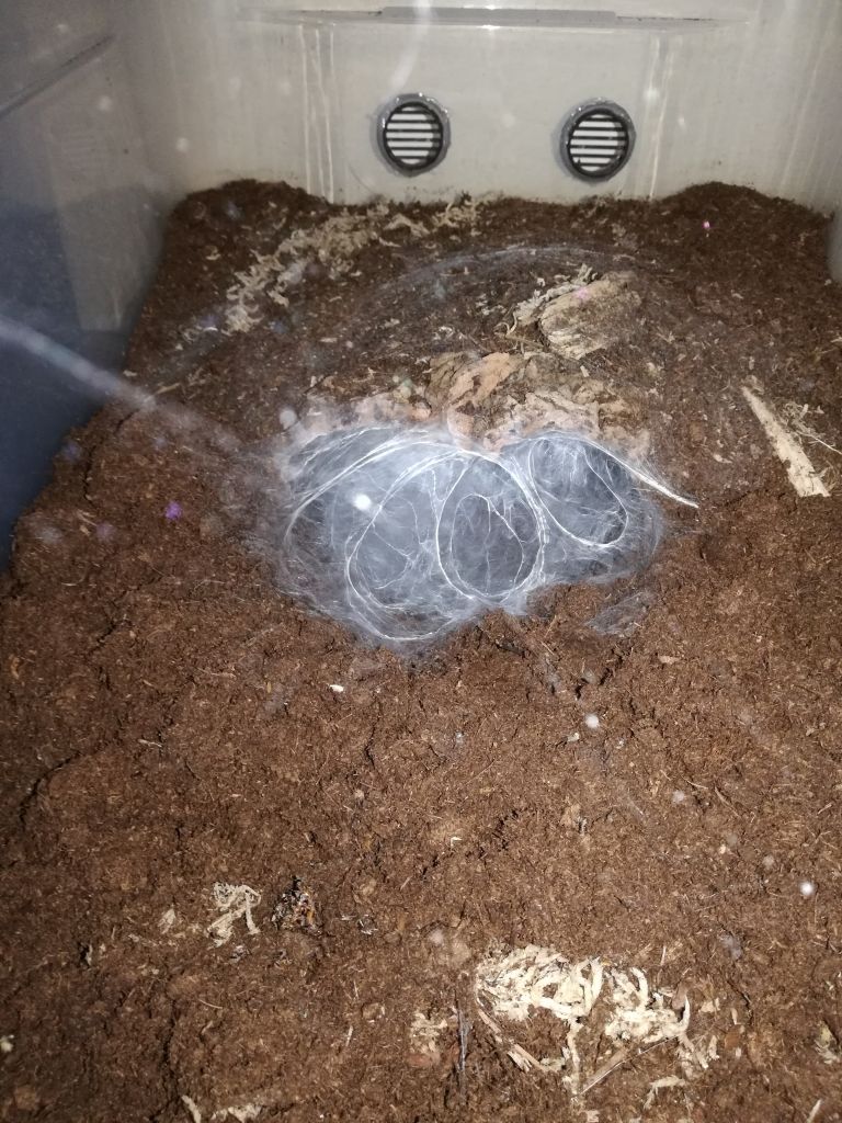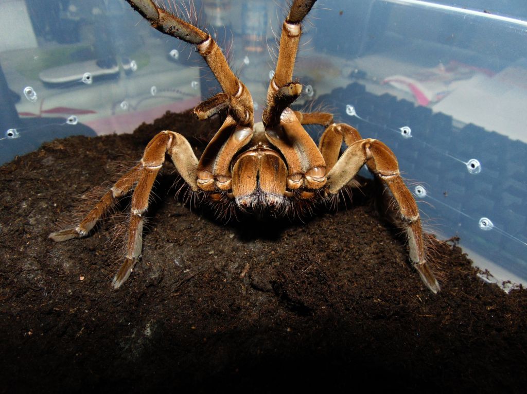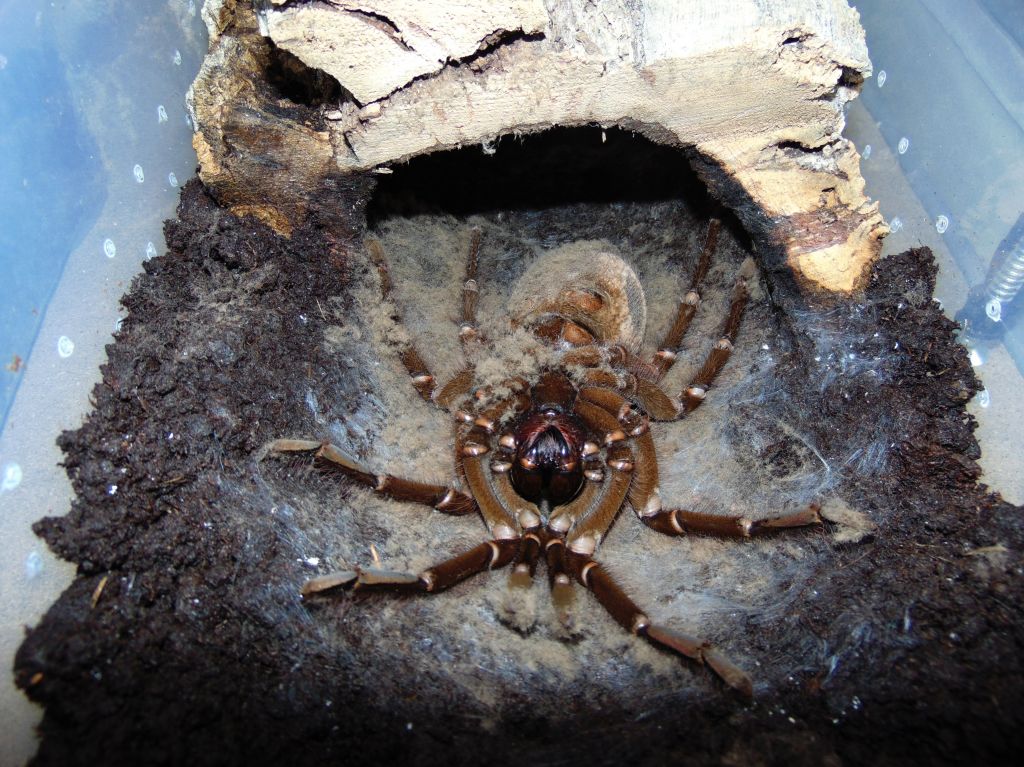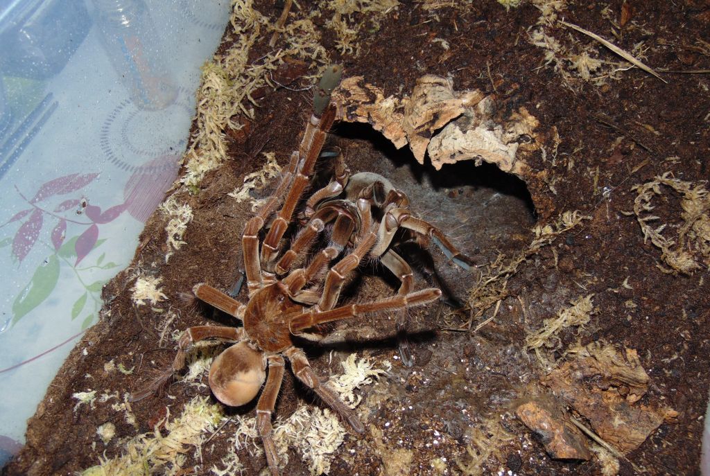 lucapappo Inviato 21 Settembre 2020 Segnala Condividi Inviato 21 Settembre 2020 Theraphosa stirmi Famiglia: Theraphosidae Sottofamiglia: Theraphosinae Nome scientifico: Theraphosa stirmi (Rudloff & Weinmann, 2010) Nome comune: Burgundy goliath bird eater Distribuzione: Guyana, Brasile Attitudine: Terricola opportunista Habitat: Foresta/Sottobosco umido. Theraphosa stirmi è solita scegliere la propria tana in grossi anfratti come buche, grossi legni o radici. Altrimenti, sfrutta tane abbandonate da altri animali adeguatamente adattate alle loro esigenze. Fotografia dell’habitat tipico di questa migale. Presa da: http://www.flegt.org/news/content/viewItem/revision-of-guyana-s-national-forestry-policy-statement-and-national-forest-plan/11-10-2016/48 Aggressività: Theraphosa stirmi è una migale molto aggressiva. La loro prima arma di difesa sono i peli urticanti che verranno abbondantemente scalciati con l’ultimo paio di zampe sfregando l’opistosoma, successivamente assumerà la classica posizione intimidatoria (display) alzando le zampe anteriori mostrando e muovendo le enormi zanne. Questa specie è anche nota per il fatto che è facile sentire i suoni emessi dagli apparati stridulatori. Su una scala da 1 a 10 viene collocata a 8 ed è quindi sconsigliata ad un neofita (anche per la sua capacità di compiere scatti repentini). Fotografia del tipico display di Theraphosa stirmi. Rapidità di crescita: Medio/veloce (dovuta anche alle già notevoli dimensioni degli spiderlings, il cui legspan si aggiro intorno ai 3cm). I tempi di maturazione sono indicativamente di 5 anni per le femmine e di 4 per i maschi. Descrizione: Theraphosa stirmi è molto apprezzato in terraristica per le notevoli dimensioni, che possono superare tranquillamente i 25cm di legspan. Presenta una colorazione color nocciola uniforme su tutto il corpo, più chiara della sorella Theraphosa blondi dalla quale è facilmente distinguibile per l’assenza di peluria sulle patelle. Allevamento: Per allevare Theraphosa stirmi occorre un terrario più grande della media a cui siamo abituati. Può andare bene una vasca da almeno 20 litri (o in alternativa un cubo di almeno 40x40x40 cm3) allestita per migali con attitudini terricole con abbondante substrato. Verrà poi posizionata una grossa tana a mezzaluna dove stazionerà per la maggior parte del tempo. Il range di temperatura ideale è tra i 18°C (inverno) e i 25°C gradi (estate). Resistono bene fino ai 28/30 °C poi iniziano a mostrarsi irrequiete tentando di evadere dal terrario in cerca di refrigerio. È consigliato mantenere un alto tasso di umidità , 80/90%. Alimentazione: Theraphosa stirmi in natura si nutre principalmente di invertebrati ma non disdegna anche piccoli vertebrati. Nelle fasi iniziali di crescita accetta ogni tipo di preda delle adeguate dimensioni. Allo stadio adulto si possono somministrare grosse blatte (come Gromphadorhina portentosa) con cadenza mensile. Saltuariamente si può somministrare anche carne cruda che andrà posizionata sul substrato e che verrà consumata successivamente senza problemi. Se, invece, non dovesse essere consumata andrà rimossa per evitare la formazione di muffe. Curiosità: Il genere Theraphosa sp., nel periodo precedente all’ecdisi, tende a coprire interamente il substrato con una quantità molto abbondante di peli urticanti, a tal riguardo bisogna prestare molta attenzione alla rimozione dell’esuvia essendo (i peli) molto volatili. In questa fotografia si può vedere l’abbondante strato di peli urticanti posizionati intorno alla migale dall’animale stesso durante le prime fasi dell’ecdisi. Accoppiamento e riproduzione: Solitamente sarebbe meglio accoppiarla tra settembre e novembre a temperature casalinghe per poi avere le deposizioni a inizio estate. Tipicamente i maschi maturi raggiungono il legspan delle femmine. Non si sottolineano particolari avversioni all’accoppiamento da parte delle femmine. Gli ovisacchi contengono all’incirca 100 uova, ma i numeri possono essere tranquillamente più alti. Date sulle deposizioni e schiuse: Prima schiusa: Accoppiamento 09/2018 Deposizione 07/2019 Secondo stadio larvale L2 08/2019 Prima muta 11/2019 Seconda schiusa: Accoppiamento 11/2019 Deposizione 07-08/2020 Secondo stadio larvale L2 09/2020 Prima muta (11/2020) Accoppiamento: L’accoppiamento, se ben gestito con sincronizzazione delle mute di entrambi gli esemplari, risulta sempre molto tranquillo. Le femmine devono essere comunque sempre ben alimentate. Durante la fase di corteggiamento vedremo il maschio vibrare e grattare il substrato con i pedipalpi, successivamente la femmina tamburellerà insistentemente sul terreno in risposta. Il tamburellamento da parte della femmina continuerà anche durante l’approccio (come in foto) e fino all’inserimento dei bulbi da parte del maschio. Preparazione dell’ovisacco: Dopo ben quasi 10 mesi ha avuto inizio la prima deposizione. Se viene fornito un set up adeguato l’entrata della tana verrà completamente sbarrata per evitare intrusioni da parte di elementi esterni come sporcizia, predatori o comunque ospiti indesiderati. La chiusura della tana e la preparazione dell’ovisacco va fatto coincidere con il graduale abbassamento dell’umidità del terreno e l’innalzarsi delle temperature. In questa foto la tipica sbarratura della tana pre deposizione. Ovisacco: In questo caso, l’ovisacco è stato prelevato e aperto manualmente dopo 5 settimane dalla deposizione, a temperature costanti la presenza di larve di secondo stadio era di oltre il 90%. All’interno sono stati contati un totale di 130+ esemplari. Sling: Una volta raggiunga la prima muta (1fh) gli sling risultano molto tolleranti tra di loro, anche se comunque è sempre preferibile dividerli dopo pochi giorni dalla muta. Questa fotografia è stata fatta da Riccardo Cavalcante, che ha acconsentito ad una sua pubblicazione. Link al commento Condividi su altri siti Altre opzioni di condivisione...